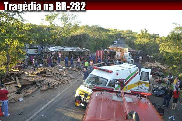 Um acidente entre uma carreta e um ônibus com placas gaúchas causou pelo menos 25 mortes na BR-282, no oeste de Santa Catarina. A colisão aconteceu por volta das 3h deste sábado no km 639 da rodovia, em Descanso, entre os municípios de São Miguel do Oeste e Maravilha. O Hospital São Miguel do Oeste havia informado, equivocadamente, que eram 29 mortos, mas o número foi corrigido pela instituição.