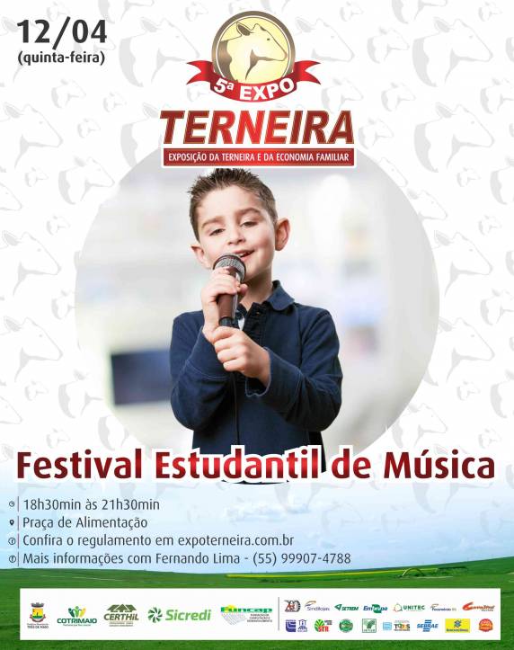 O regulamento completo e a ficha de inscrição estão disponíveis no site www.expoterneira.com.br. Mais informações sobre o Festival podem ser obtidas com Fernando Lima, através do fone/whats 99907-4788, ou com Ana Baiotto pelo e-mail abaiotto@yahoo.com.br ou nos fones 3535-2170 ou 3535-1338.